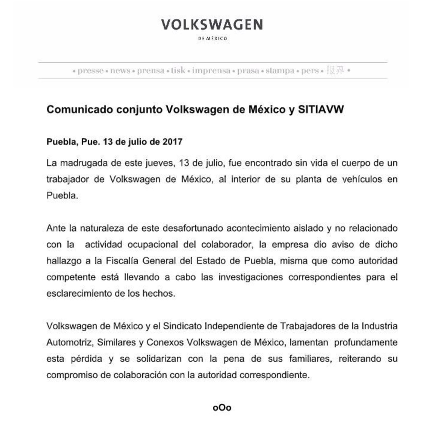 De acuerdo con un comunicado de Volkswagen, el trabajador murió en lo que calificó de un “acontecimiento aislado y no relacionado con la actividad ocupacional del colaborador”, dando aviso a las autoridades quienes abrieron la carpeta de investigación 11294/2017/ZC.