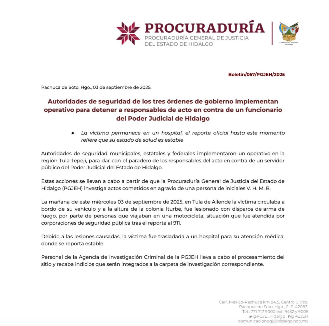 La Procuraduría General de Justicia del Estado (PGJE) de Hidalgo informó que el juez de Control se reporta estable.