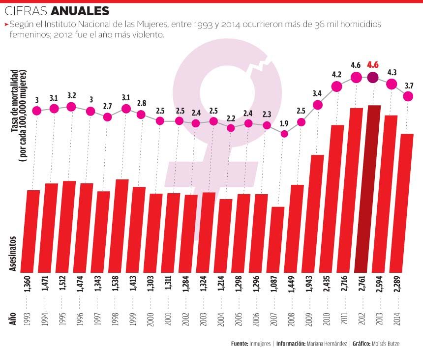 El estudio “La violencia feminicida en México, aproximaciones y tendencias, 1985-2014”, elaborado por ONU-mujeres, el Instituto Nacional de las Mujeres (INMUJERES) y la Secretaría de Gobernación (SEGOB), destacó que de 2007 a 2012, los feminicidios en México pasaron de mil 87 a dos mil 761, más del doble.