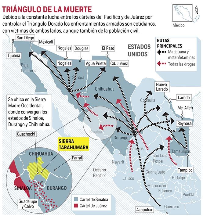 Es de destacar que la zona del Triángulo Dorado comprende la sección de la sierra Tarahumara donde convergen los estados de Sinaloa, Durango y Chihuahua, territorio fértil para la siembra de enervantes.