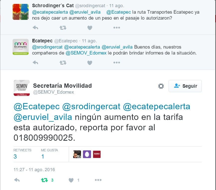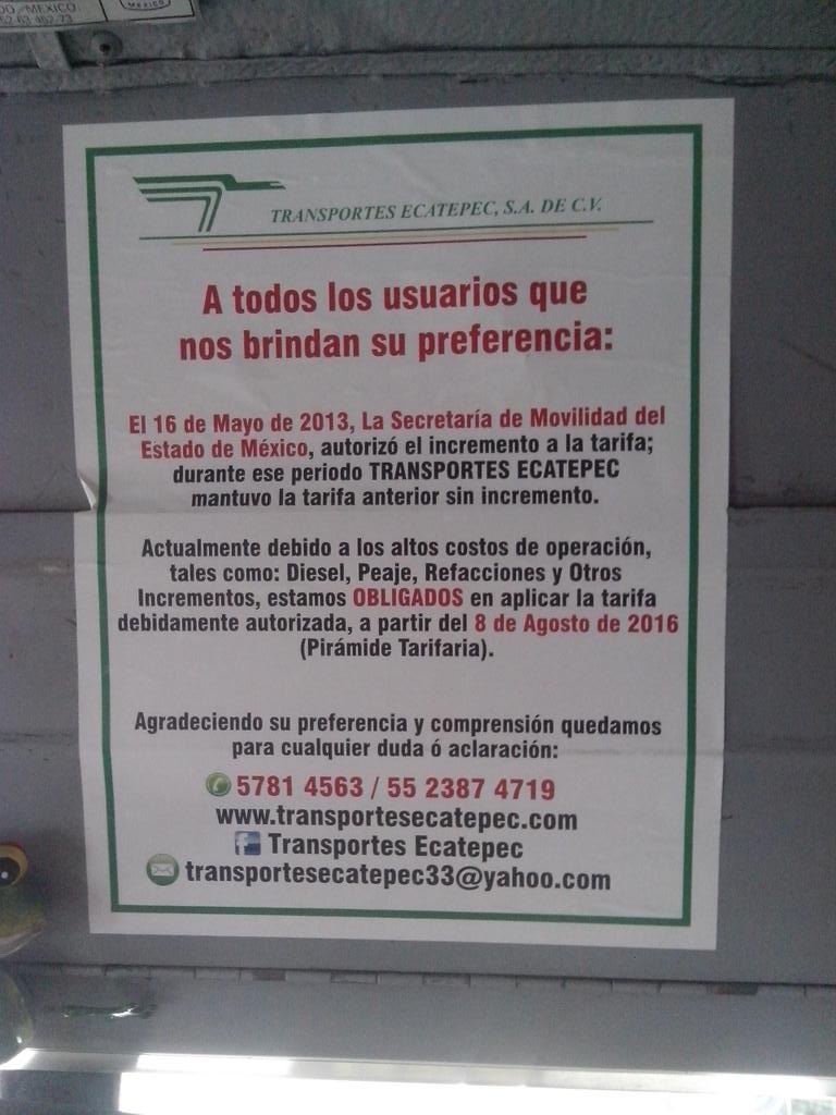 Pese a que la Secretaría de Movilidad del Estado de México (Semovi) negara el aumento solicitado por la Cámara Nacional de Autotransporte de Pasaje y Turismo (Canapat) en las tarifas del transporte, la Línea de Transportes Ecatepec incrementó desde el pasado 8 de agosto las cuotas de sus cuatro rutas que incluyen los municipios de Coacalco, Tultitlán, Ecatepec y Tecámac.
