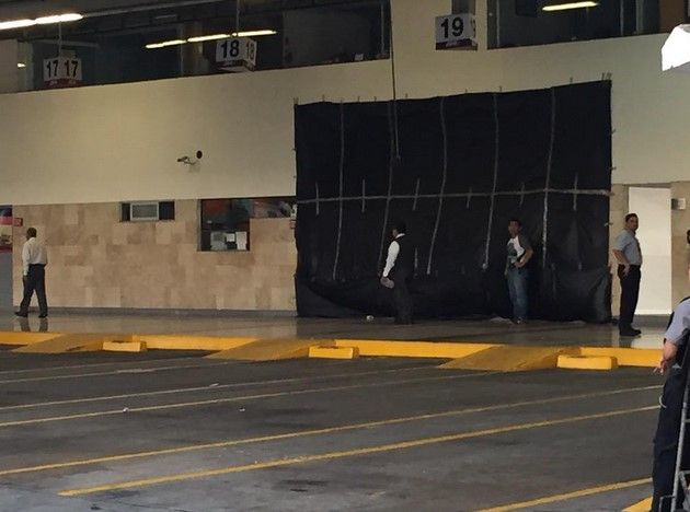 Posteriormente, el boquete que dejó el camión foráneo fue cubierto por una lona negra. Mientras que el autobús presentó daños en el parabrisas.