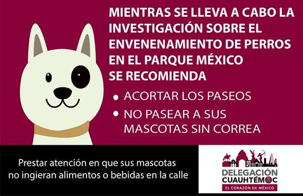 Debido a las denuncias de vecinos que reportan el envenenamiento de 18 mascotas en los parques México y España de la colonia Condesa, el secretario de Seguridad Pública del Distrito Federal, Hiriam Almeida, y el secretario de Protección Civil, Fausto Lugo, ordenaron a la Brigada de Vigilancia Animal y personal de la delegación Cuauhtémoc inspeccionar los parques.