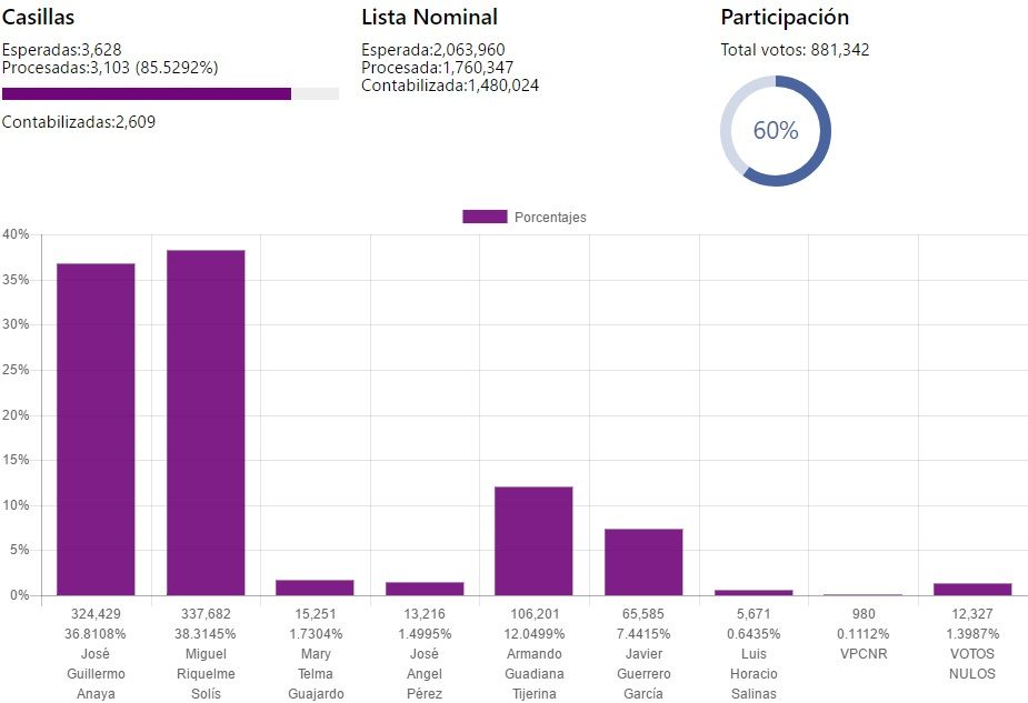 Miguel Ángel Riquelme aventaja con un 38.2166 por ciento a Guillermo Anaya, quien se ubica con 36.8473 por ciento de los votos