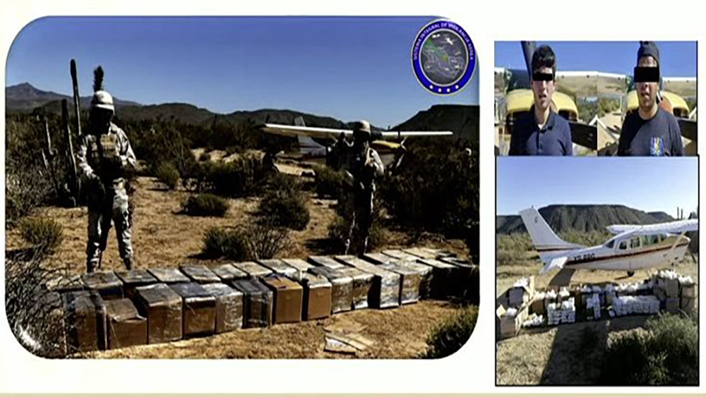 Al interior de la aeronave fueron asegurados más de 379 kilos de metanfetamina; más de 59 kg de fentanilo en polvo; más de 48 kg de pastillas de fentanilo y más de 23 kg de cocaína en polvo.