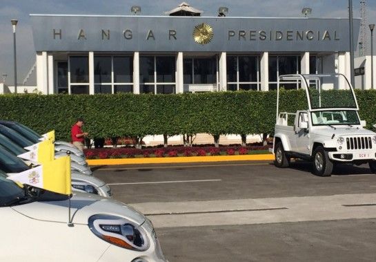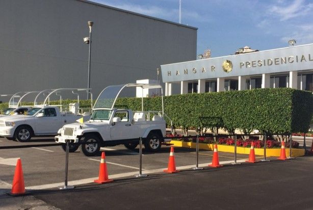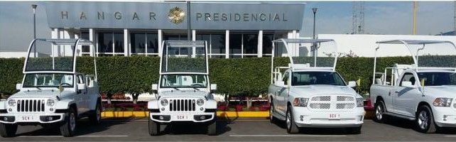 Se trata de dos vehículos Jeep Wrangler y tres camionetas Dodge Ram, que serán utilizados en la Ciudad de México, Ecatepec, Tuxtla Gutiérrez, San Cristóbal, Morelia y Ciudad Juárez, como parte de la visita del sumo pontífice a México.