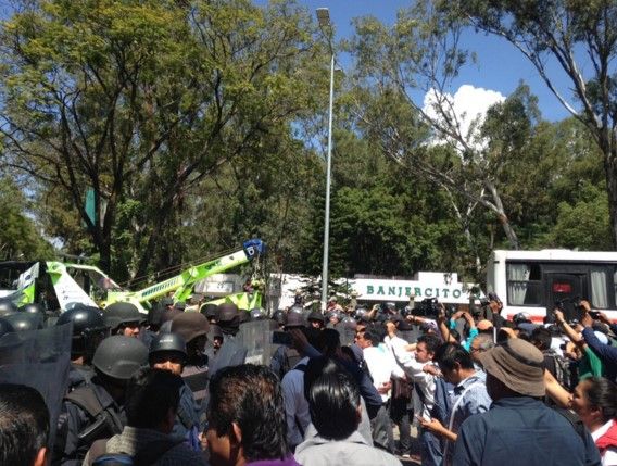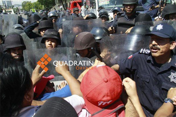 Luego de dialogar con los dirigentes sindicales, encabezados por Rubén Núñez Ginez, para que levantaran el bloqueo intentaron retirarlos avanzando con sus escudos al frente pero los docentes no se movieron.