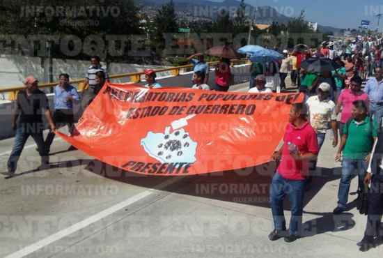 Una representación de maestros, padres de familia y alumnos de las Preparatorias Populares de la Costa Chica de Guerrero bloquearon los cuatro carriles de la Autopista del Sol a la altura del Parador del Marqués.