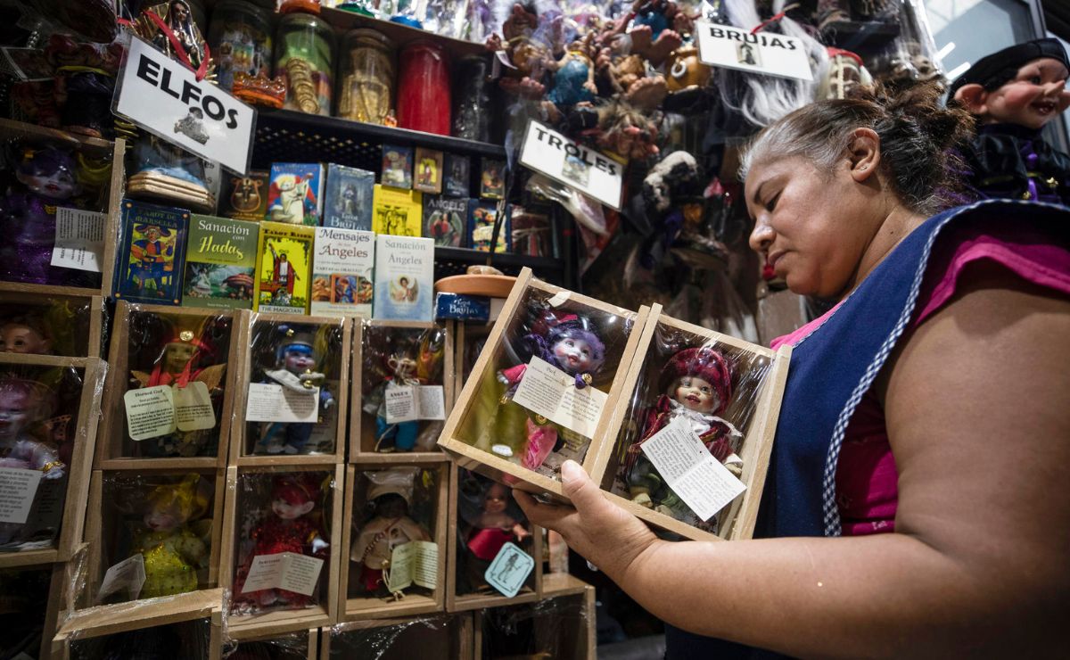 Nancy Márquez hace su compra para captar “la buena suerte” y asegura creer en Dios, pero también en las limpias de los brujos y en los amuletos, símbolos en los que deposita su fe desde 2022, un año antes de que se anunciara el fin de la emergencia sanitaria por la pandemia de COVID-19.