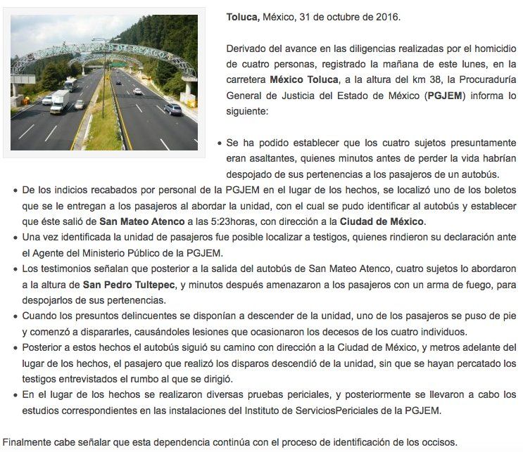 Por su parte, la Procuraduría General de Justicia del Estado de México emitió un comunicado donde dio a conocer los avances sobre el homicidio de cuatro personas registrado la mañana de este lunes, en la carretera México-Toluca, a la altura del kilómetro 38.