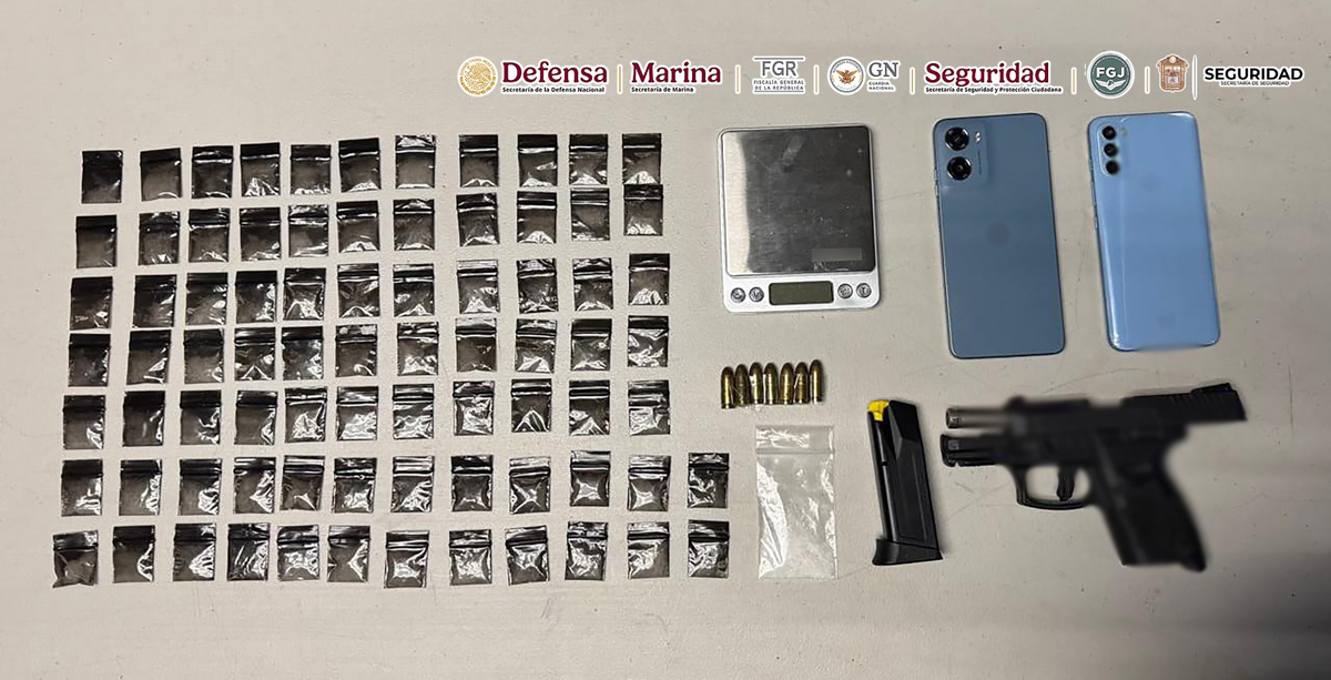 Los agentes hallaron un arma de fuego corta, un cargador, cartuchos útiles, 79 dosis de crystal, una báscula gramera y dos teléfonos celulares.