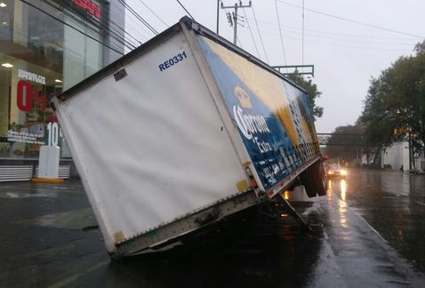 El conductor realizaba maniobras para bajar la caja que contenía las cervezas en el cruce de avenida Popocatépetl y calle San Felipe, pero una pierna del tren de aterrizaje se hundió debido al peso de la carga, provocando que el contenedor se fuera de lado.