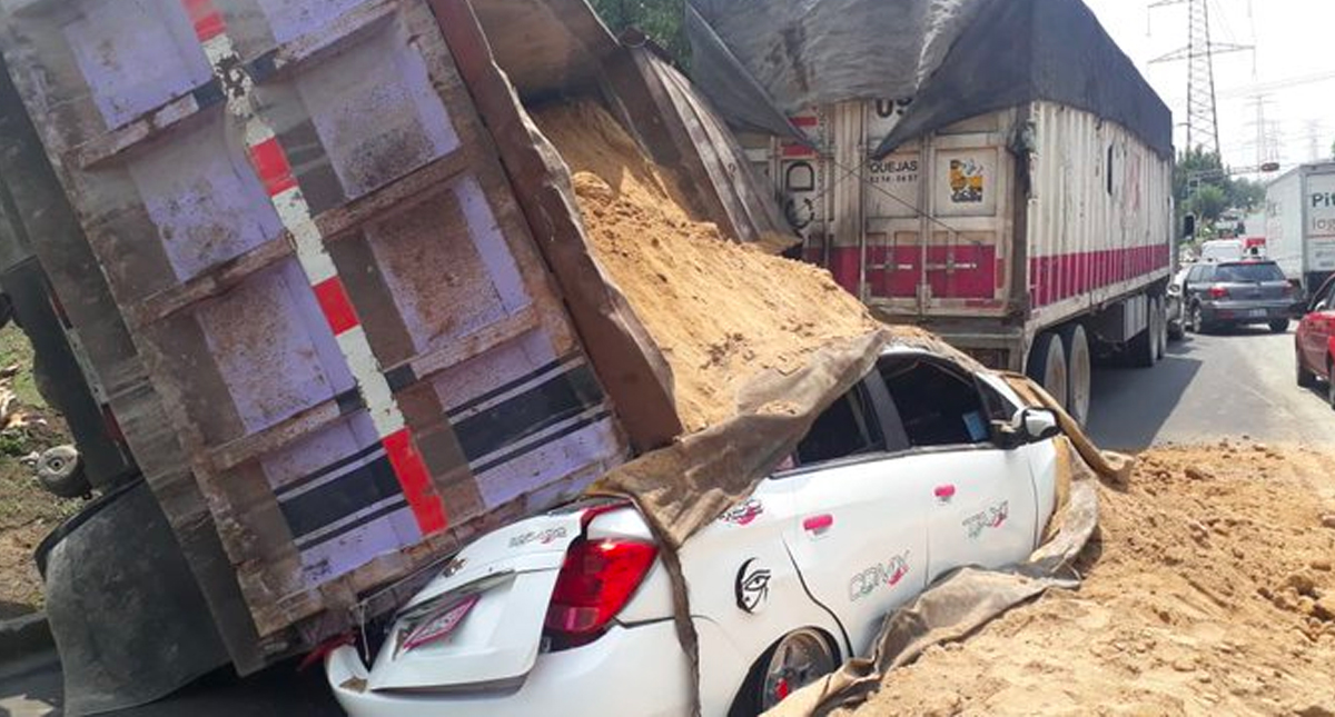 La tarde de este jueves, un camión tipo torton cargado con arena volcó y aplastó a un taxi de la Ciudad de México que viajaba con dos pasajeros menores de edad, y afortunadamente, a pesar de lo aparatoso del incidente, no se registraron víctimas mortales.