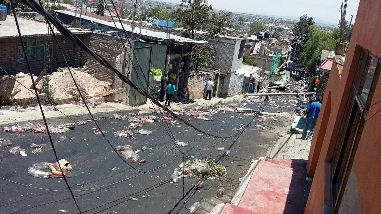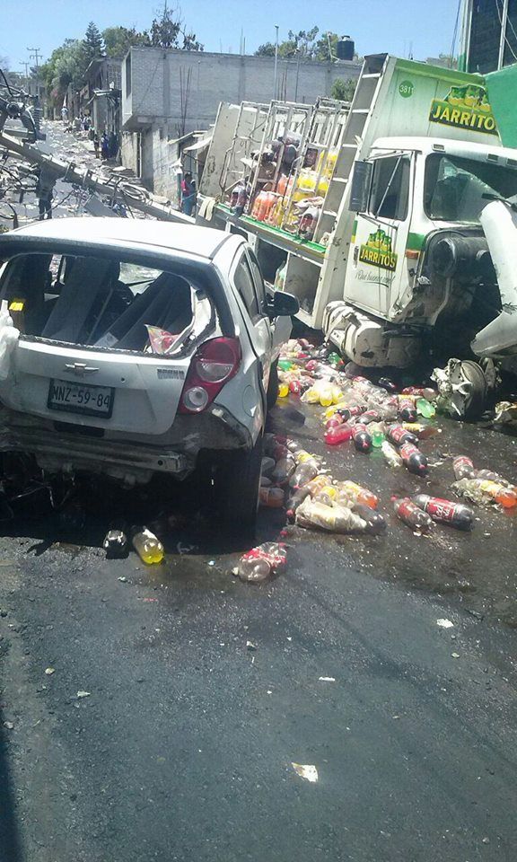 Este sábado, un camión de refrescos de la marca Jarritos se quedó sin frenos en una avenida con pendiente en el municipio de Chimalhuacán, dejando como saldo seis personas heridas, así como daños a diversos vehículos y postes de luz.