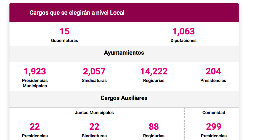 “El número de personas que participaron en las diferentes candidaturas a diputaciones federales y locales, gubernaturas, alcaldías, presidencias municipales, juntas municipales, presidencias de comunidad, primeras concejalías de ayuntamiento, sindicaturas y regidurías, da cuenta de la complejidad del actual proceso electoral, el más grande de la historia”, indicó el INE.