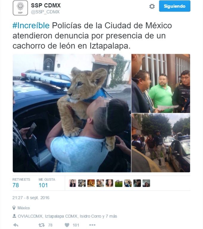 Elementos de la Secretaría de Seguridad Pública atendieron el día de ayer reportes de que en calles de la delegación Iztapalapa un joven caminaba con un cachorro de león de tres meses de edad.