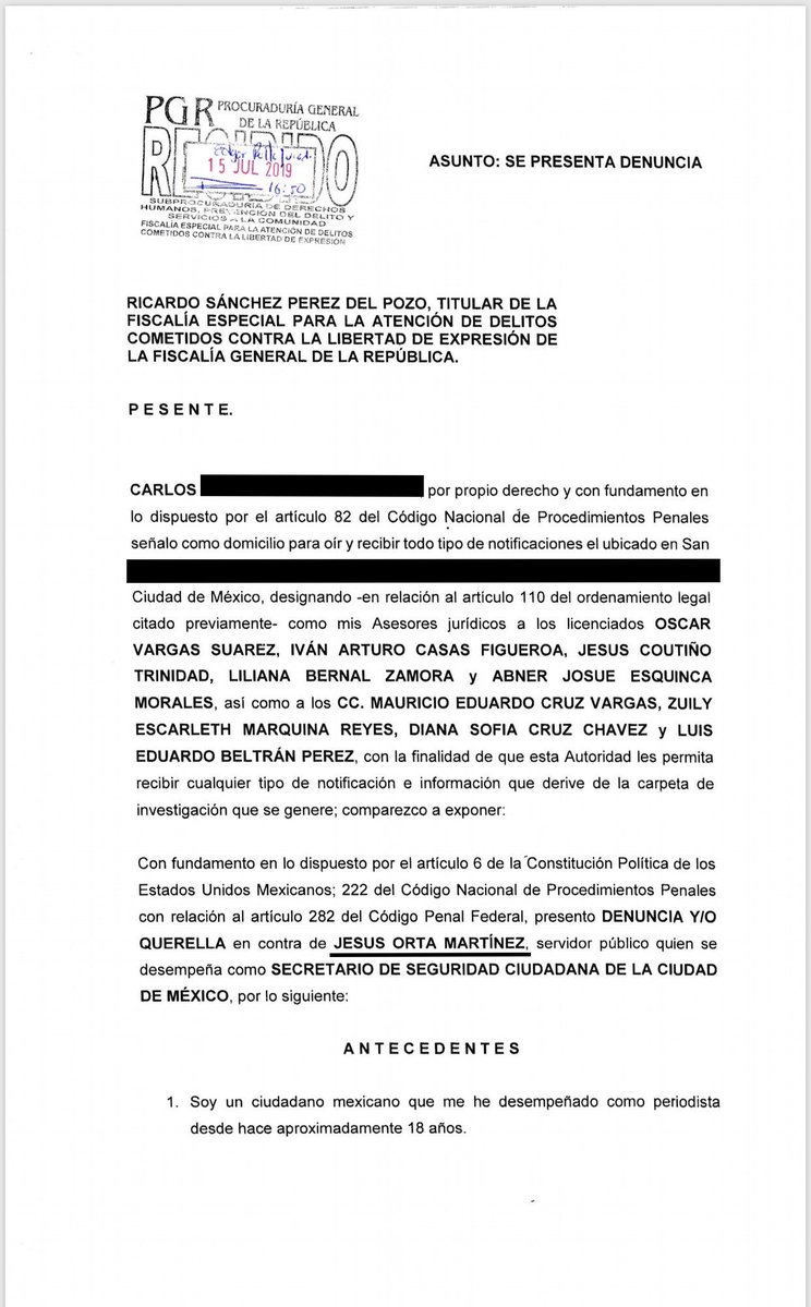 El reportero Carlos Jiménez presentó la tarde del 15 de julio una denuncia formal contra el titular de la Secretaría de Seguridad Ciudadana de la Ciudad de México (SSC-CDMX), Jesús Orta, ante la Fiscalía General de la República (FGR).