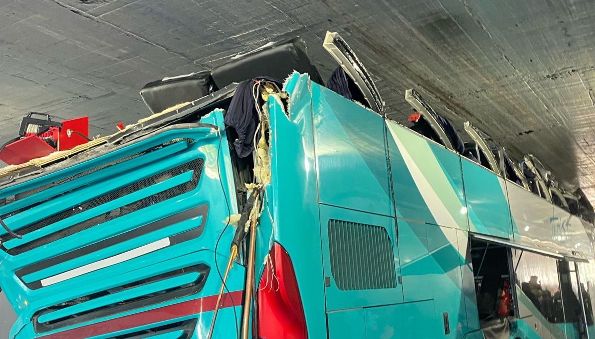 La altura del autobús le impidió cruzar con éxito el bajopuente, provocando que el techo de la unidad se desprendiera y se dañara la fila de asientos en la parte de arriba.