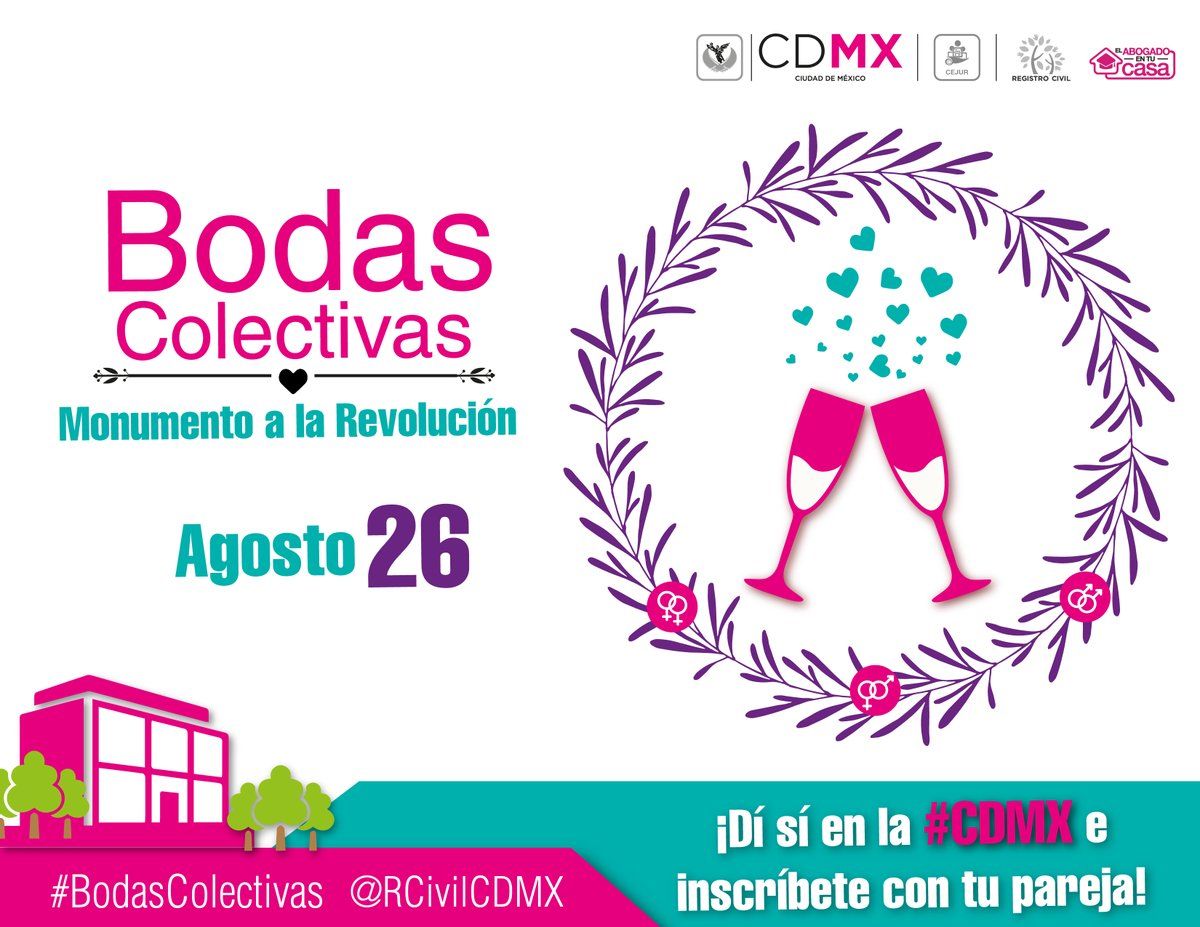 El Gobierno de la Ciudad de México, a través del Registro Civil capitalino, invitó a las parejas mayores de edad que piensen en casarse a inscribirse para formar parte de las Bodas Colectivas que se realizarán el 26 de agosto en el Monumento a la Revolución.