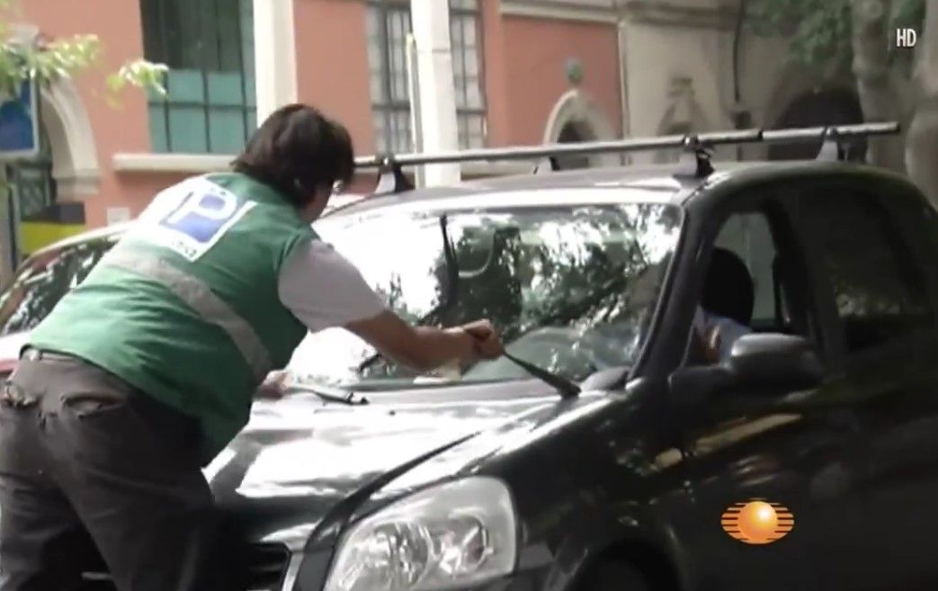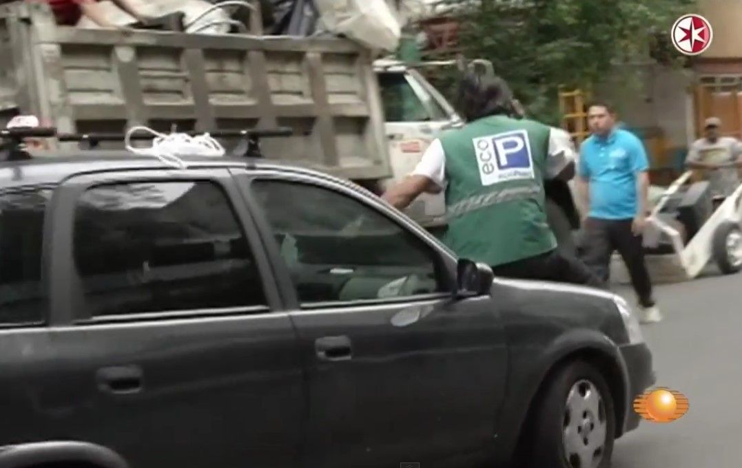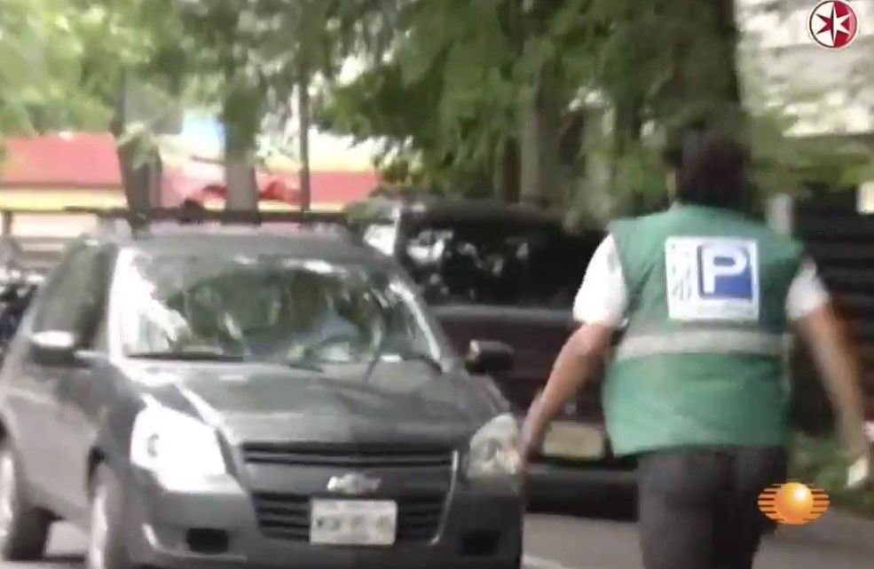 En las calles de la colonia Roma Norte, del Distrito Federal, un empleado de EcoParq se subió al cofre de un automóvil, para impedir que el conductor se fuera sin pagar.