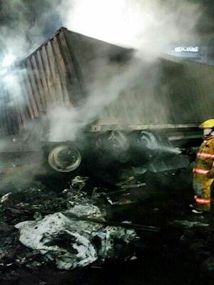 Por exceso de velocidad, dos tráileres y una camioneta impactaron a la altura de la Araucaria, provocando el incendio de las tres unidades