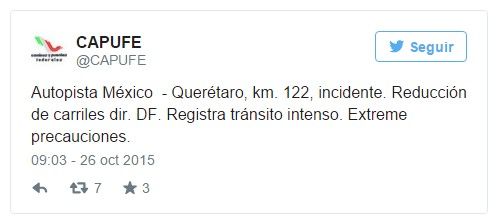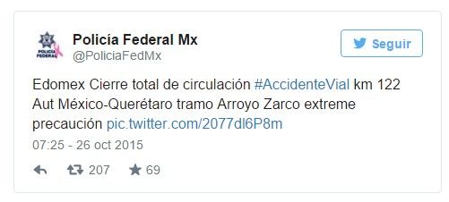 De acuerdo con su cuenta de Twitter, el percance se suscitó en el kilómetro 122 a la altura de Arroyo y Zarco, con dirección al Distrito Federal, por lo que en la mañana la autopista tuvo que ser cerrada por tiempo indefinido.