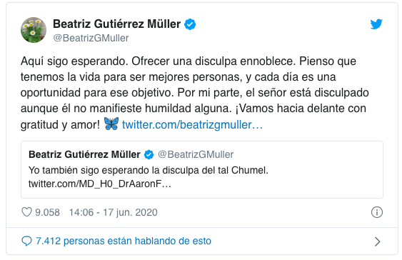 Después de que la esposa del presidente Andrés Manuel López Obrador, Beatriz Gutiérrez Müller, exigiera que Chumel Torres se disculpara por haber ofendido a su hijo menor de edad, el comediante utilizó su cuenta de Twitter para enviarle una disculpa.