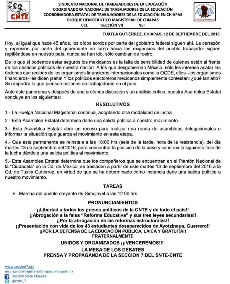 En tanto, la Asamblea determinó que los miembros de las secciones 7 y 40 de la CNTE que se encuentran en el plantón de la Ciudadela, en la capital del país, regresen este martes a Chiapas. “En virtud de que se ha determinado como instancia darle una salida política a nuestro movimiento”.