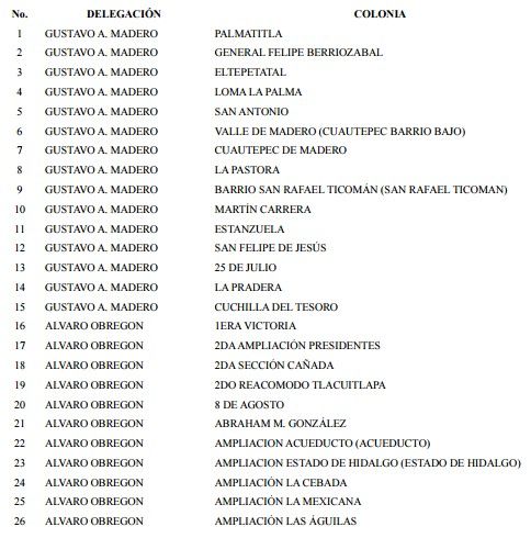 El Gobierno de la Ciudad de México condona totalmente el pago de los derechos por el suministro de agua a los contribuyentes de 176 colonias de las delegaciones Gustavo A. Madero, Iztacalco, Coyoacán, Iztapalapa, Álvaro Obregón y Venustiano Carranza.