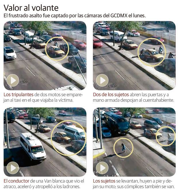 Cuando se efectuaba el asalto, algunos vehículos avanzaron. De ellos, dos autos atrás del taxi, estaba una camioneta tipo Van color blanca. De acuerdo con las imágenes, el conductor se salió del carril y aceleró para arrollar a los ladrones.
