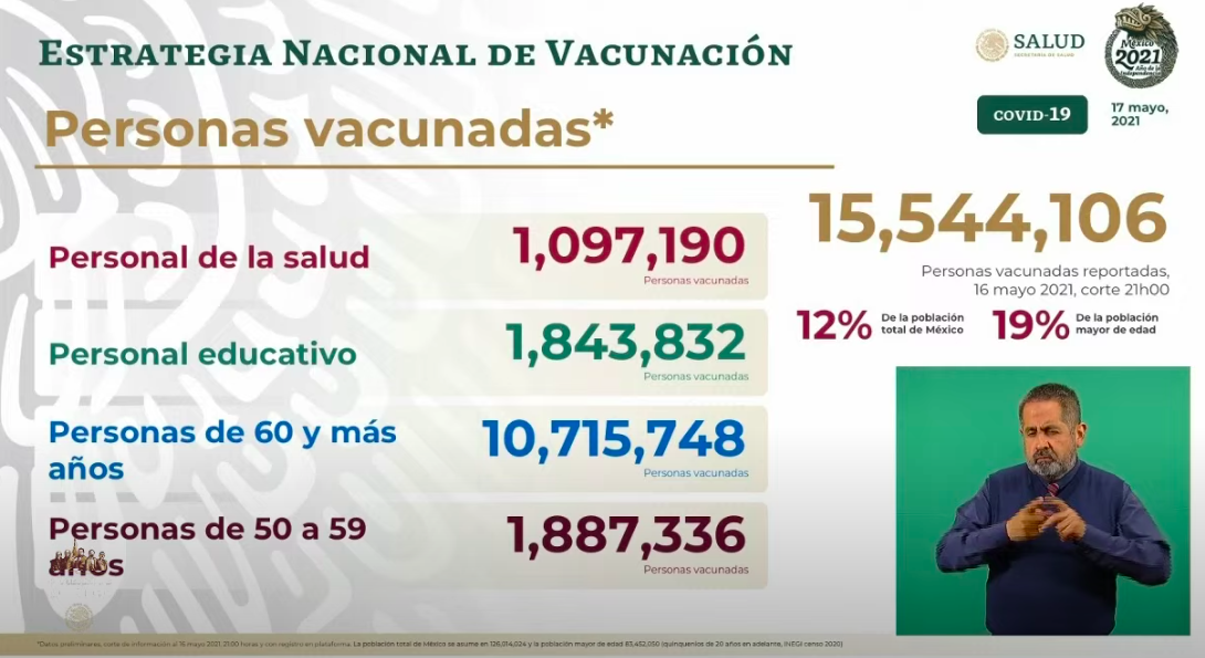 Sobre la vacunación a adultos de 60 y más años se han aplicado 10 millones 715 mil 748 dosis.