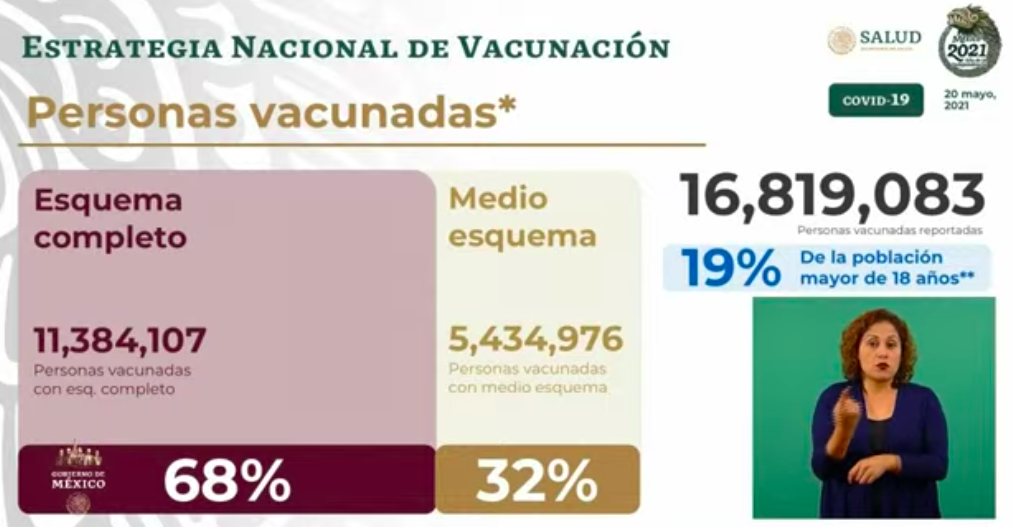 Hasta este jueves, 16 millones 819 mil 83 personas han sido vacunadas, esto representa el 19 por ciento de la población mayor de 18 años.