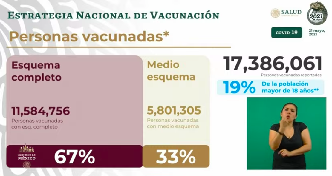 Hasta este viernes, 17 millones 386 mil 61 personas han sido vacunadas, esto representa el 19 por ciento de la población mayor de 18 años.
