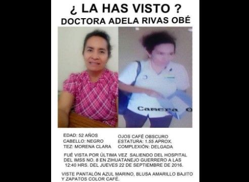 El fiscal general de Guerrero, Xavier Olea Peláez, afirmó en conferencia de prensa que las pruebas de ADN y estudios periciales practicados a un cuerpo de mujer encontrado en playa Majahua, revelaron que se trata de la doctora del Instituto Mexicano del Seguro Social (IMSS), Adela Rivas Obé, desaparecida desde el pasado 22 de septiembre en Zihuatanejo.