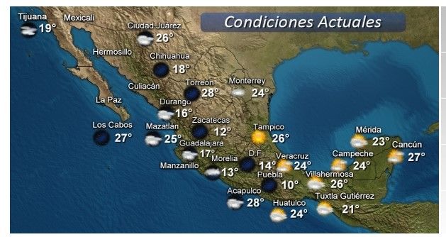 Mientras que en Chihuahua, Durango, San Luis Potosí, Nayarit, Jalisco, Colima, Oaxaca, Chiapas, Veracruz, Tabasco y Quintana Roo se esperan valores de 35 a 40 grados centígrados.