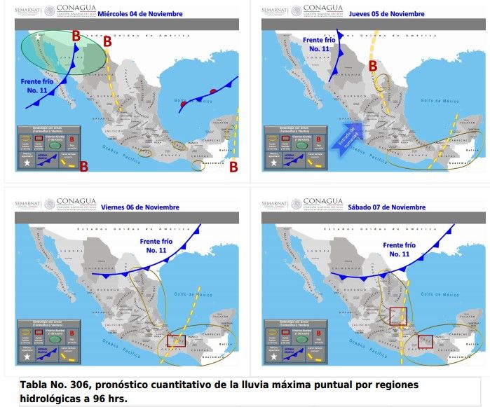 El frente frío número 11 favorecerá el desarrollo de nublados con potencial de lluvias menores en Baja California Sur, Baja California, Sonora, Chihuahua, Durango y Sinaloa, además de un marcado descenso de temperatura y vientos fuertes en Baja California.