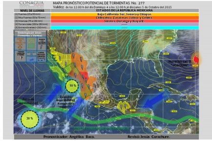 Lo anterior provocará precipitaciones pluviales fuertes en Chihuahua, Durango, Sinaloa y Nayarit, y de menor intensidad en Baja California, Baja California Sur, Sonora, Coahuila, Aguascalientes, Zacatecas, Jalisco, Colima, Michoacán, Guanajuato, Estado de México, Distrito Federal y Morelos.