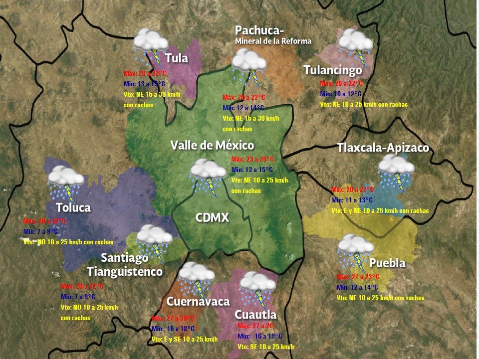 Se estima para la Mesa Central cielo nublado, tormentas puntuales intensas en Puebla, fuertes a muy fuertes en el resto de la región. Ambiente cálido y viento con rachas superiores a 50 km/h durante el paso de los sistemas de tormenta.