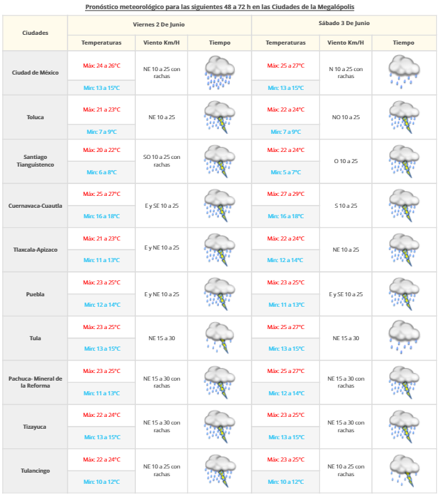El organismo precisó que se pronostican tormentas puntuales torrenciales en Oaxaca, y tormentas intensas en Puebla, Guerrero, Veracruz, Chiapas, Tabasco y Campeche. Tormentas muy fuertes en Michoacán, Estado de México, Morelos y Yucatán, y fuertes en Chihuahua, Ciudad de México, Tlaxcala, Hidalgo, San Luis Potosí y Tamaulipas.