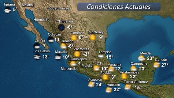 Se prevén de cero a cinco grados Celsius en zonas montañosas de Tamaulipas, San Luis Potosí, Aguascalientes, Jalisco, Michoacán, Estado de México, Hidalgo, Puebla, Tlaxcala y Distrito Federal.
