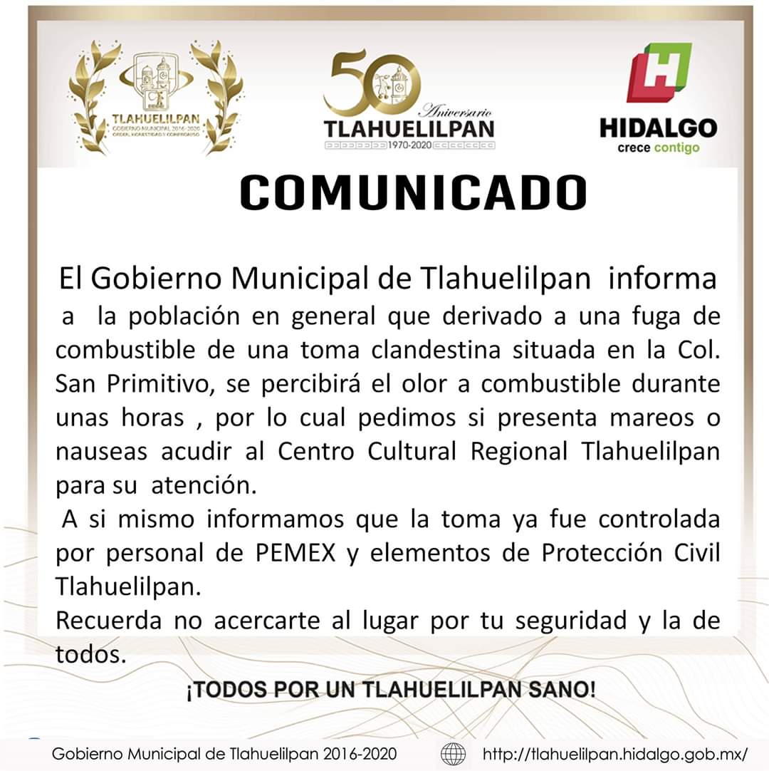 En un comunicado, el gobierno municipal señaló que la fuga de combustible ocurrió en una toma clandestina en la colonia San Primitivo, y advirtió que, en las siguientes horas, se percibirá en la localidad olor a combustible.