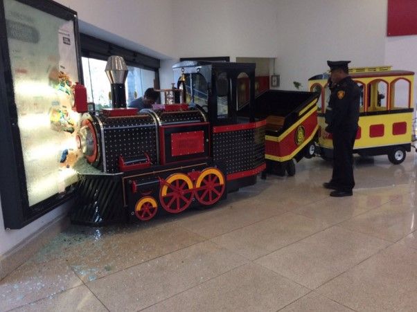 El personal de la plaza comerical asegura que el conductor perdió el control del tren al momento de dar una vuelta, por una falla en los frenos.