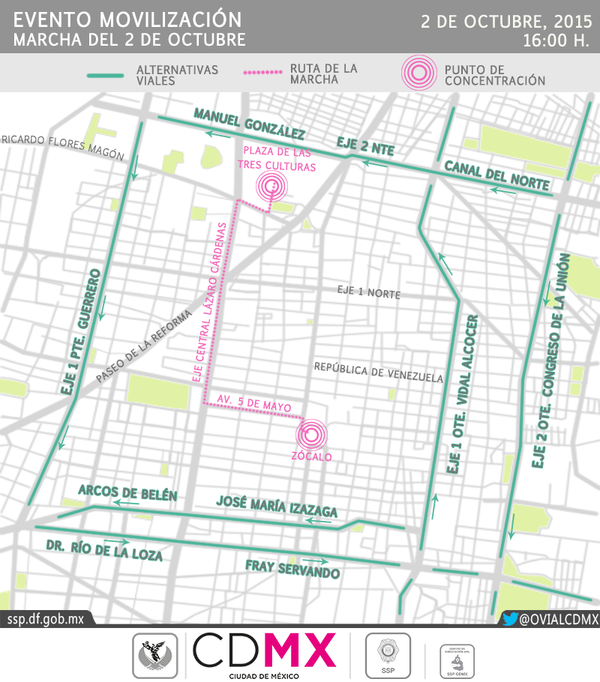 La Policía capitalina detalló que en la Marcha del 2 de Octubre participarán al menos 20 contingentes de estudiantes y organizaciones que partirán a las 16:00 h de este viernes de la Plaza de las Tres Culturas, en Tlatelolco, hacia el Zócalo capitalino.