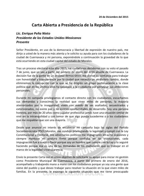 Este domingo, Cuauhtémoc Blanco, presidente electo de Cuernavaca, envió una carta al presidente Enrique Peña Nieto, en la cual solicita su ayuda para cumplirle a los ciudadanos del municipio morelense.