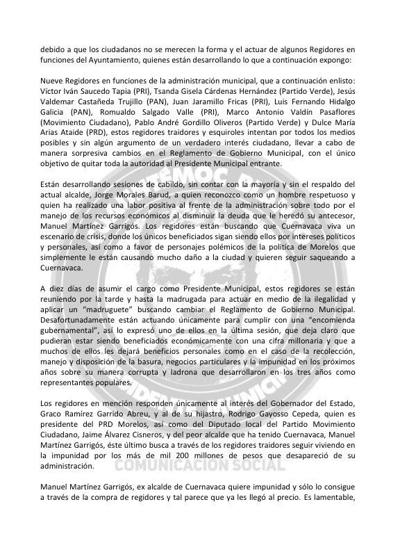 “Los regidores están buscando que Cuernavaca viva un escenario de crisis, donde los únicos beneficiados sigan siendo ellos por intereses políticos y personales, así como a favor de personajes polémicos”, afirma la carta.