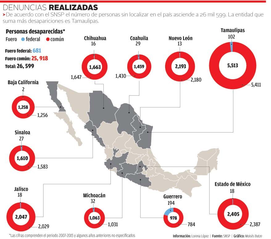 Las denuncias del fueron común ascienden a 25 mil 918 y las averiguaciones de la PGR a 681 lo que da un total de 26 mil 599 reportes de personas extraviadas o desaparecidas.