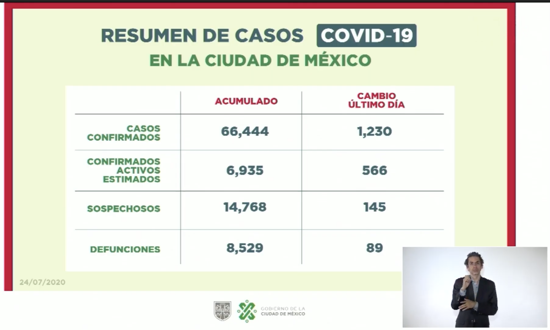 En la presentación del Informe COVID-19 y de la operación del Semáforo de Riesgo Epidemiológico en la Ciudad de México ante el nuevo coronavirus, el gobierno lleva registrados 66 mil 444 casos positivos confirmados, mil 230 en las últimas 24 horas.