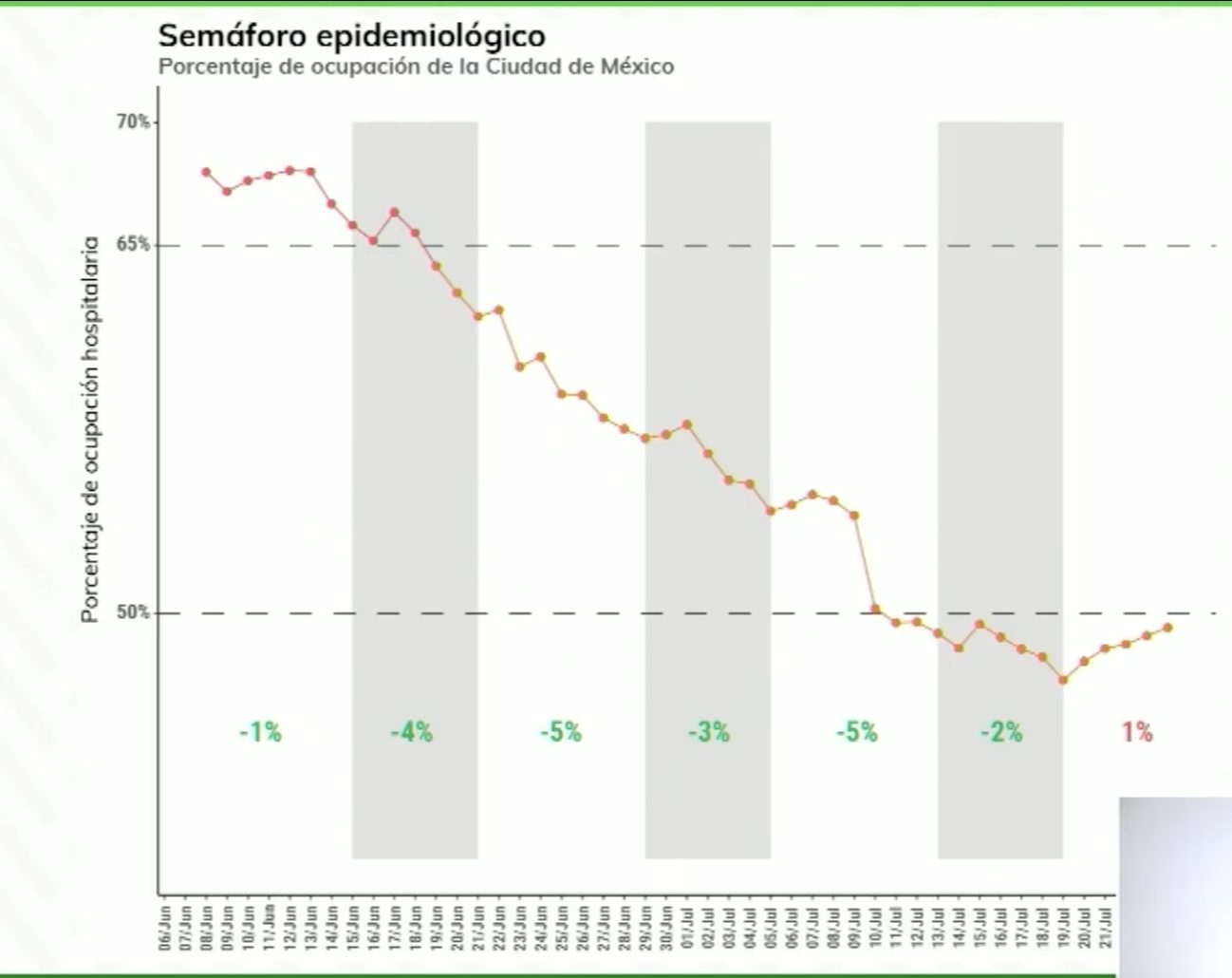 Al presentar el Semáforo Epidemiológico, el Gobierno de la Ciudad de México expuso que los últimos cinco días, la Secretaría de Salud local registró un aumento en la ocupación de camas generales para la atención del COVID-19.