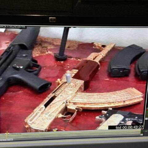 A los 21 presuntos delincuentes se les decomisó 10 armas largas, tres mil 35 cartuchos de diversos calibres y 48 cargadores para diferentes armas, entre las que se encontraba un cuerno de chivo de oro y una escuadra 45 igual hecha de oro.