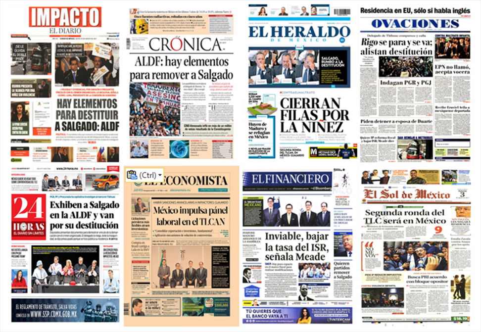 Este jueves, los principales periódicos de México destacaron en sus primeras planas que el jefe delegacional de Tláhuac, Rigoberto Salgado Vázquez, sostuvo que no renunciará, ni pedirá licencia, ni está amparado, tampoco huirá o se esconderá porque, según él, todos los señalamientos en su contra son falsos.